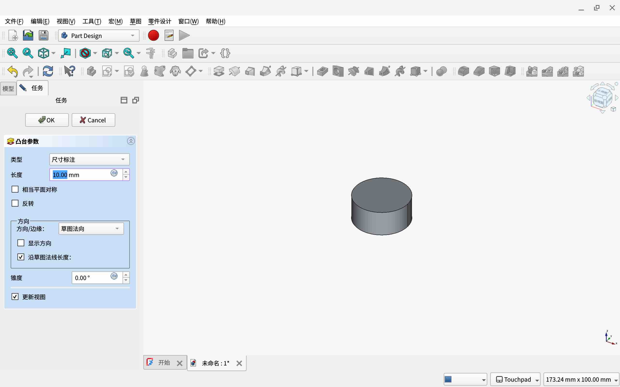 点击任务中的凸台构建凸台(需要草图中的线首尾相连且构成封闭图形)。